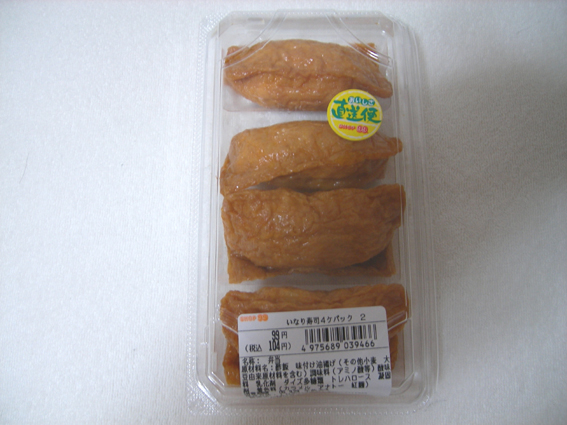 ■短評 皮の油揚げが厚く、歯ごたえを感じる。 噛んでいくと濃い目のタレが油揚げから出てきてジューシー。 多めのタレと、しっかり形成を維持する粘りけ有る御飯。 作り込んでいるような気がする。 ■料理法 パックを開けるだけ。 タレを味わうために、そのまま食うべし。 ■詳細 4つ、(有)富士弁FO (東京地区で購入の場合) ■マイリピ ★★★★☆ 濃い目のタレ、粘りけのある御飯が嫌いではないので この絡まるようなコンビネーションに製造元の苦労を感じさせる。 質・量ともに合格点!
