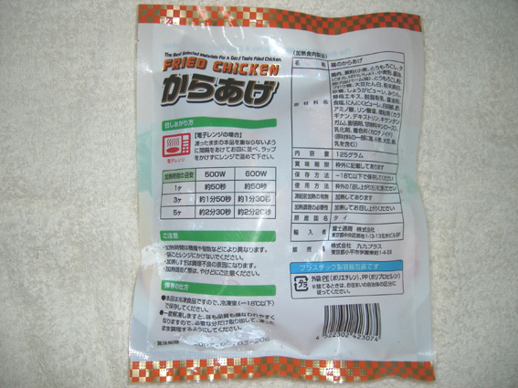 ■短評 ころもに特徴はなく、肉も特別ジューシーという訳でもない。 無難な味付け・品質といったところで、6個入りと考えると 至って普通の価格設定だろうか。 ■料理法 パックを開けるだけ。 マヨネーズをかけたり、カレーに入れたり、トッピング自由。 ■詳細 125g、富士通商(株)、タイ産 ■マイリピ ★★☆☆☆ これだったらスーパーの半額セールでニッスイのモノを買った方が 「やわらかジューシーな唐揚げ」を楽しめる。 セール以外の時の、臨時用に。